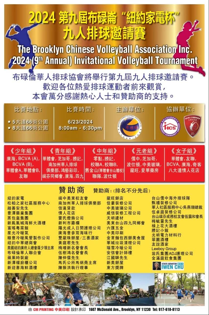 Organized by Brooklyn Chinese Volleyball Association Inc., co-organized by CASCSA and HCS - 9th Annual Brooklyn "AC & Appliances Center Cup" 9men Invitational Volleyball Tournament is coming on Sunday, June 23. Total 32 teams in 5 Divisions, teams from locals, Los Angeles, San Francisco, Chicago, DC & Boston. Thank you to all teams and sponsors. 由布碌伦華人排球协會主办, 華體會及松柏之家社區服務中心协办的第九屆布碌伦“紐約家電杯”九人排球邀請賽在6/23日在3大賽場正式展開冠亞季軍的競技. 友誼第一,比賽第二!32支由5個組別的男女球員來自紐約,羅省,三番市, 芝加哥及DC. 歡迎排球愛好者及廣大侨胞前來观賽及為队員打氣加油. 特別感謝參賽球員, 領队及各大赞助商!